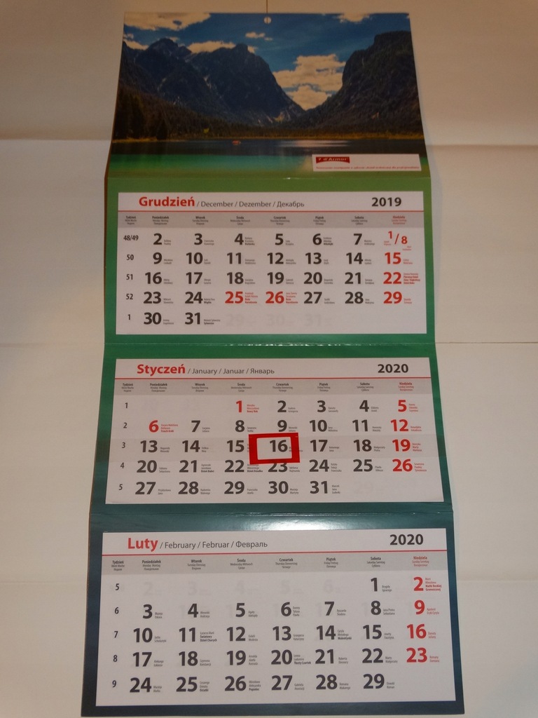 - Kalendarz wyposażony jest w pasek foliowy z okienkiem do zaznaczania dni tygodnia.